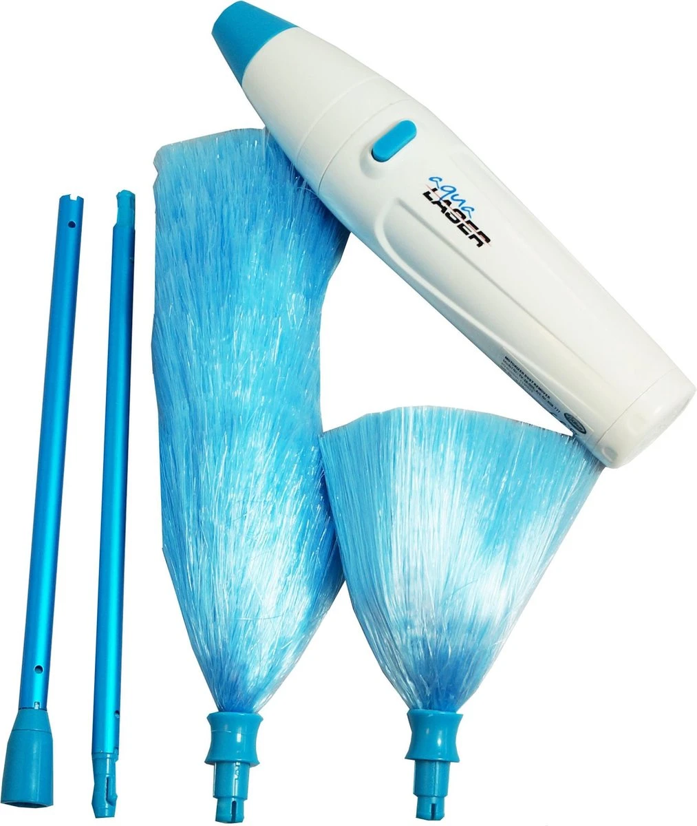 Deze superhandige spinduster op batterijen stoft razendsnel af en is veel veiliger voor kleine, wat wankel staande snuisterijen dan een gewone stofdoek. Elektrostatisch geladen haren trekken overal stof uit en vangen stof op. De Aqua Laser Turbo Duster heeft super zachte borstelharen, die zich aanpassen aan elke vorm van uw meubels en zachtjes stof weg-spinnen. Geen behoefte meer aan een veren stofdoek, doek of stof-reiniger. Boekenplanken, jaloezieën, meubels, gleuven, hoeken en andere moeilijk bereikbare plaatsen, ze zijn allemaal gemakkelijk af te stoffen. Met de verlengsteel kom je gemakkelijk bij hoger gelegen plekken als bovenop de boekenkast. De plumeaus zijn wasbaar en kunnen met de hand worden afgespoeld en vervolgens aan de lucht worden gedroogd.