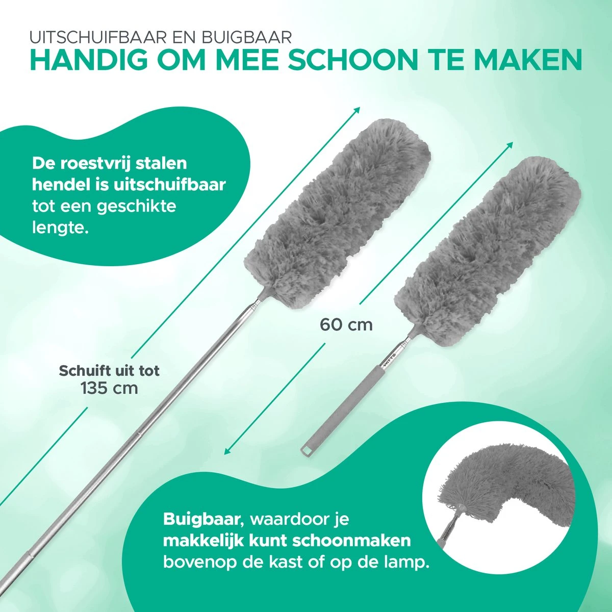 Waarom moeilijk doen als het ook makkelijk kan? Met de uitschuifbare plumeau staat u nooit meer te zwoegen om die onbereikbare hoge plekken af te stoffen. De plumeau heeft een normal lengte van 60. Wanneer u deze uitschuift, is de lengte 135 cm, zodat u gemakkelijk plafonds of de bovenkant van kasten kan bereiken.